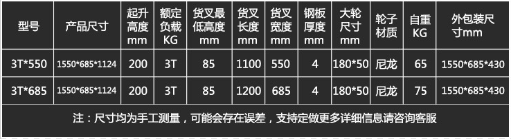 搬運車分為兩種型號:550型和685型,其具體的相關(guān)尺寸見上圖所示。其輪子也分為2種,一種是尼龍輪,一種是橡膠輪。尼龍輪適合水泥地面,橡膠輪適合大理石、油漆、環(huán)氧地面。